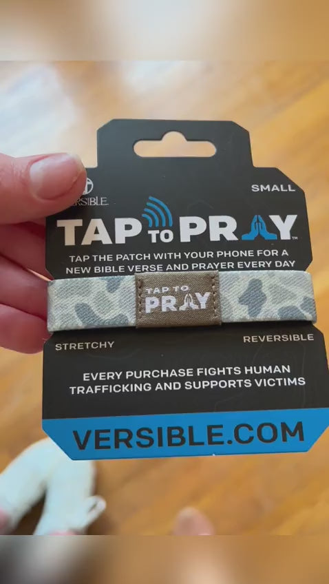 Versible is excited to introduce our new line of interactive Tap To Pray™ wristbands. No app required, just tap the patch with your smartphone to receive a new bible verse and prayer every day. Plus, get a new verse and prayer anytime you want; just hit the "New Verse" link on the bottom of the page. Tap To Pray™ bracelets work with most smartphones. Our bracelets are soft, stretchy, reversible and waterproof! The River Rock Camo Classic & Sage Tap To Pray™ wristband blends a bold camo with softer sage green in a reversible design. With 5 sizes to choose from, it's easy to find the fit that's right for you!